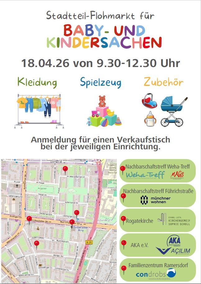 Wir machen am Samstag, 18. April von 9.30 bis 12.30 Uhr in Rogate mit beim Kindersachen-Flohmarkt-Hopping in Ramersdorf.